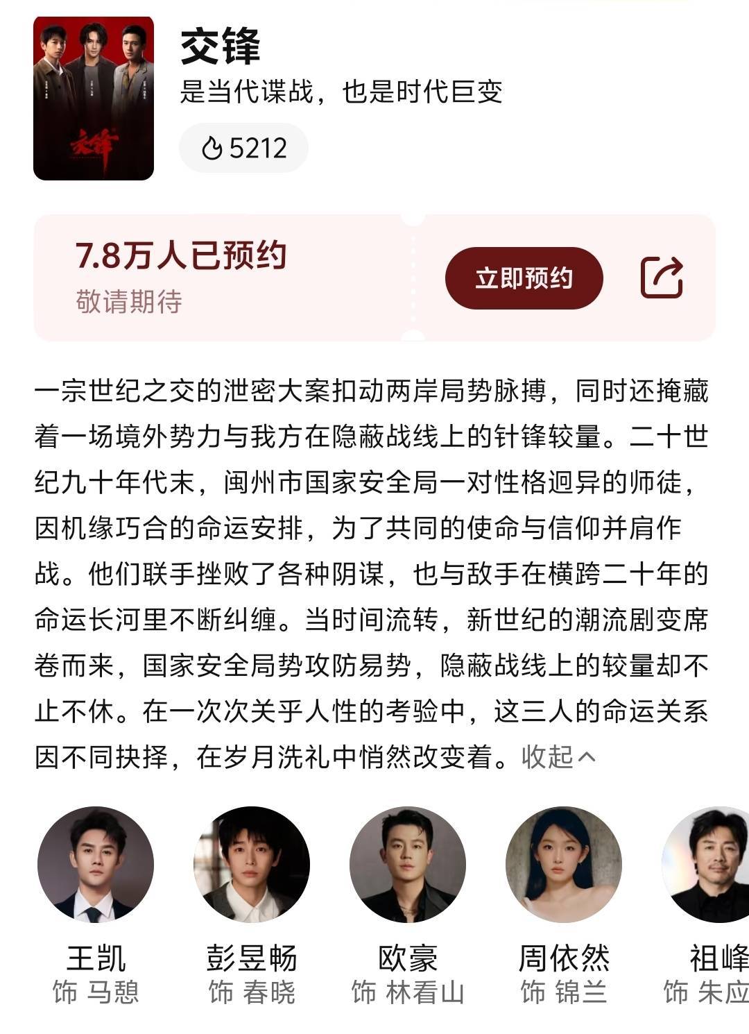 王小枪则以《对手》获奖编剧的笔力,将境外间谍渗透、核心机密守护等现实议题融入剧情,让每集反转都带着现实的棱角——欧豪饰演的"儒商"林看山,表面是商圈精英,实则是潜伏二十年的"北风"间谍,他切换正邪两面仅靠眼神微变,与王凯的对手戏如暗流对撞,被观众称为"没有硝烟的战场"。